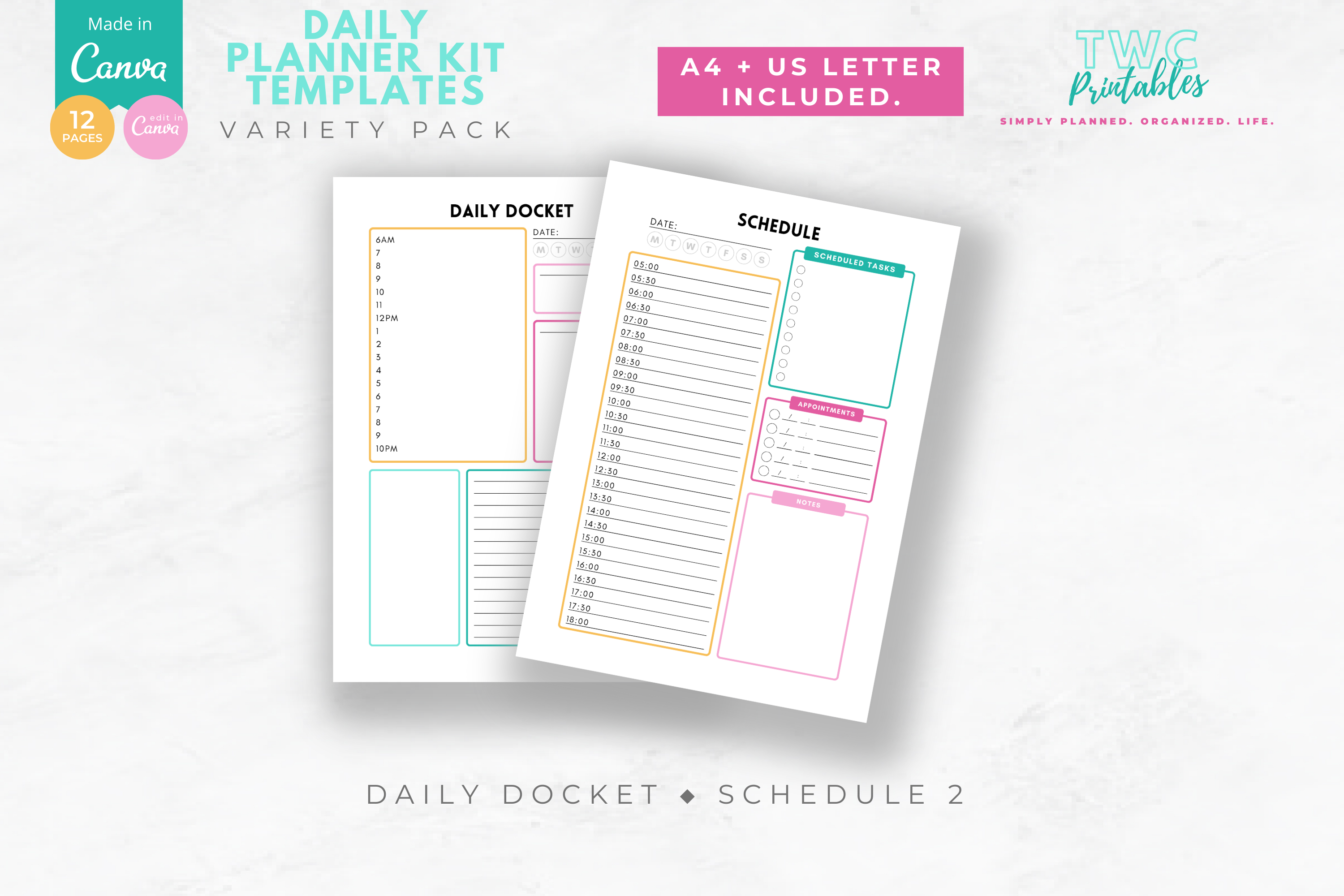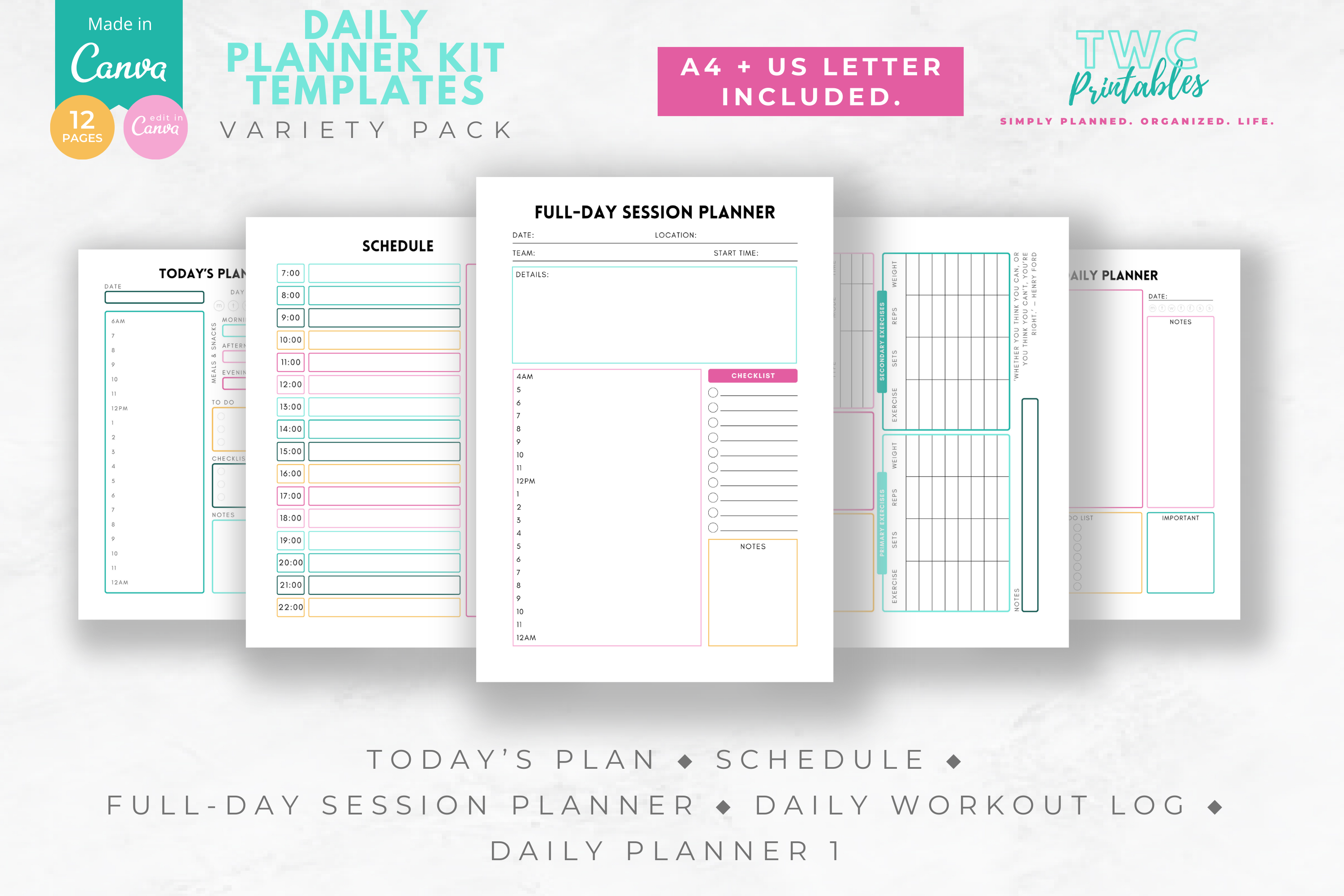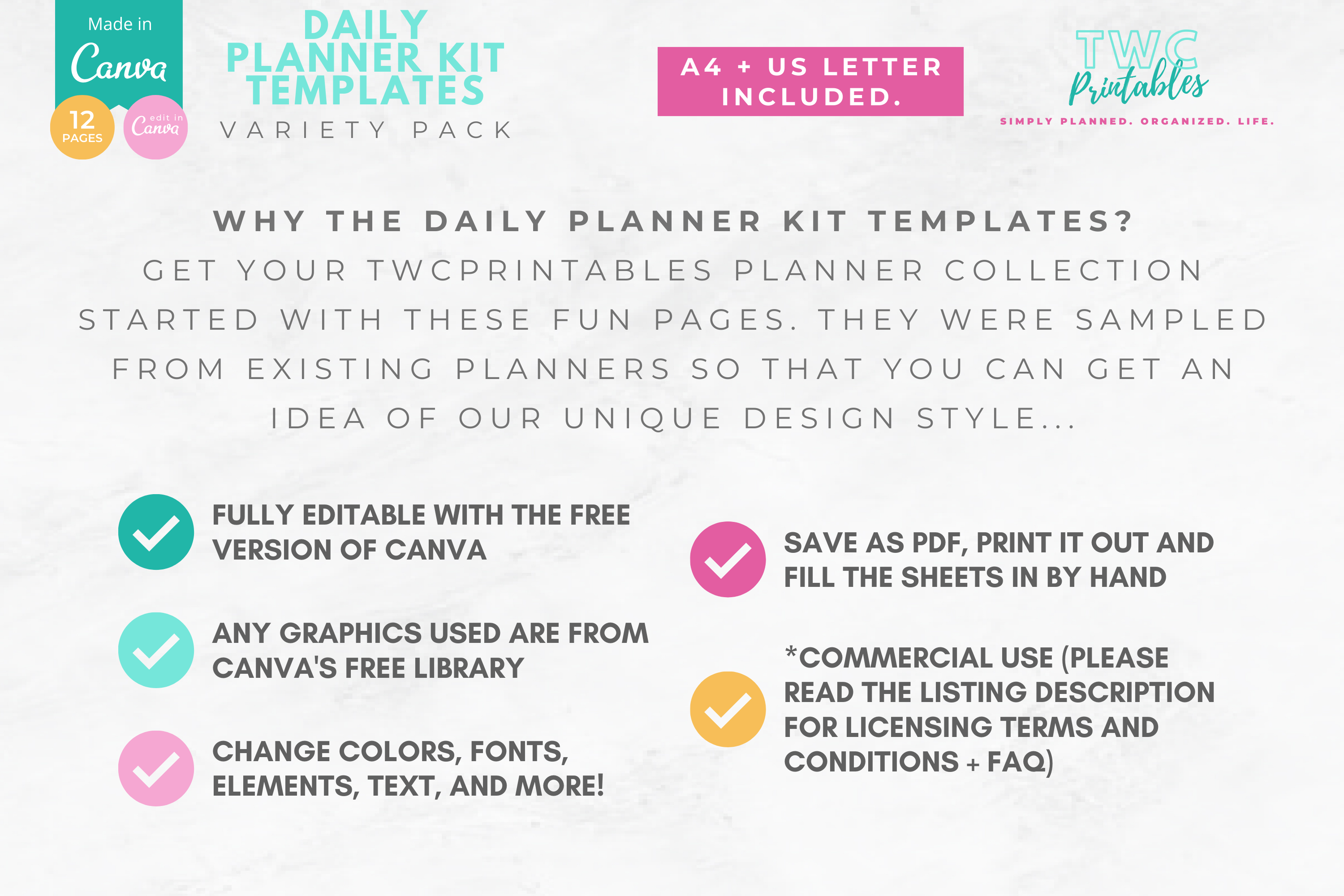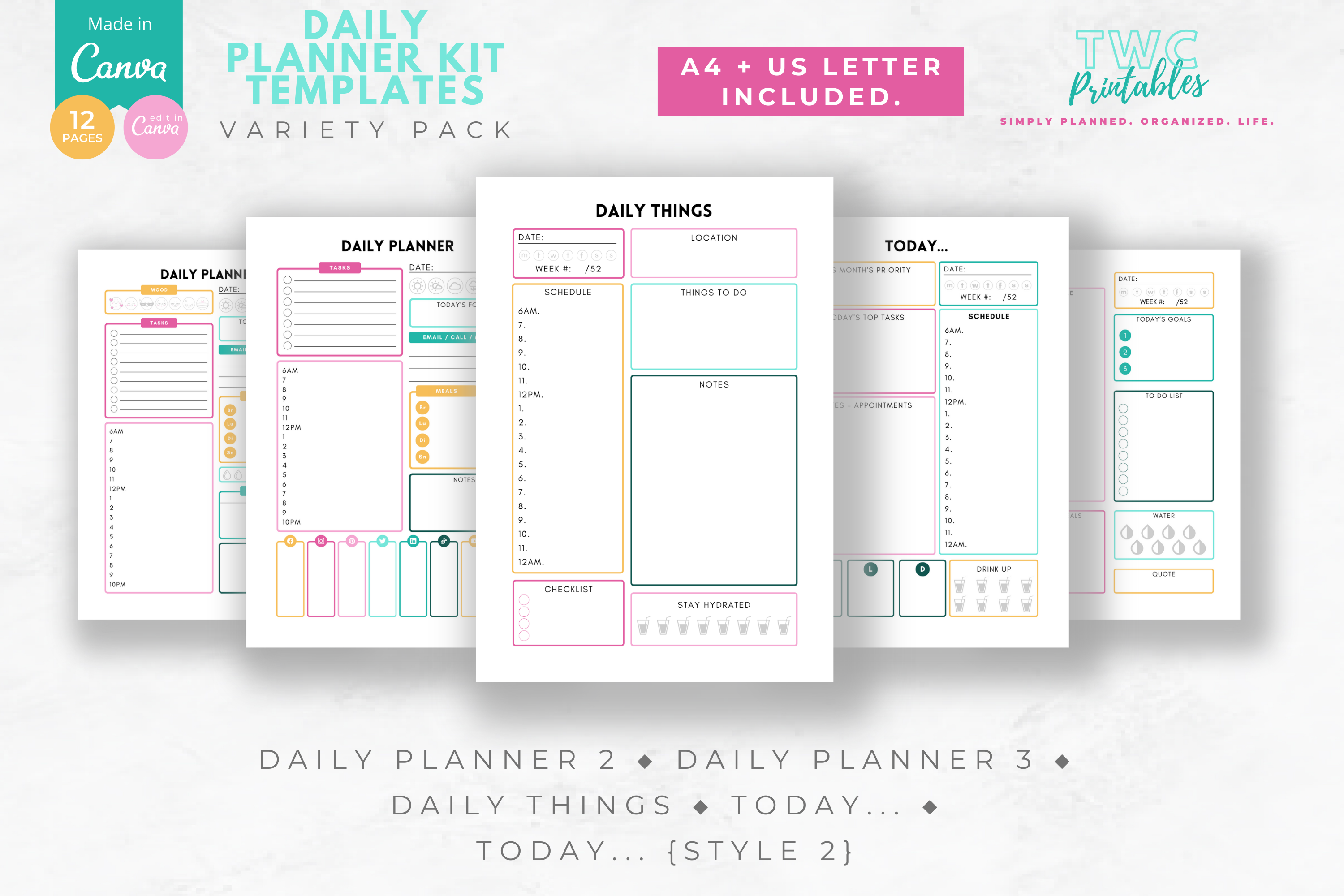 The Daily Planner Kit Templates for Canva contain 12 sheets and come in both US Letter and A4 Sizes. Please take note: This is a digital product. No physical item will be shipped.